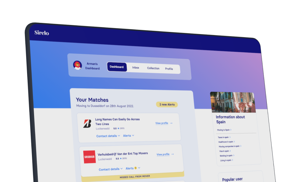 Sirelo est une plateforme de déménagement indépendante. Que vous déménagiez dans la même ville, ou a l’autre bout du monde, nous sommes la pour vous aider. Sur notre site web, vous trouverez des informations intéressantes et des guides pour votre déménagement, des outils pratiques pour vous faciliter la vie, ainsi qu’une large liste de professionnels près de chez vous. Notre but ? Vous faciliter la tâche au maximum pour votre déménagement, et peut-être vous décrocher un sourire qui sait !